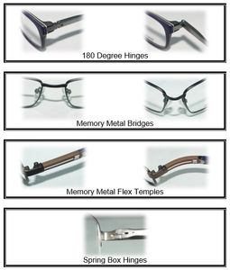 · Memory Metal Flex Temples · Spring Box Hinges